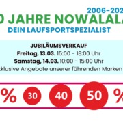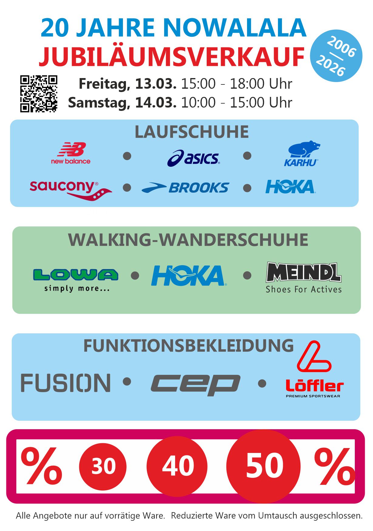 AllgemeinAm 13. und 14.03.2026 startet anlässlich unseres 20-jährigen Jubiläums unser großer Sonderverkauf mit vielen tollen Angeboten rund um Running, Walking, Wandern und Freizeit.